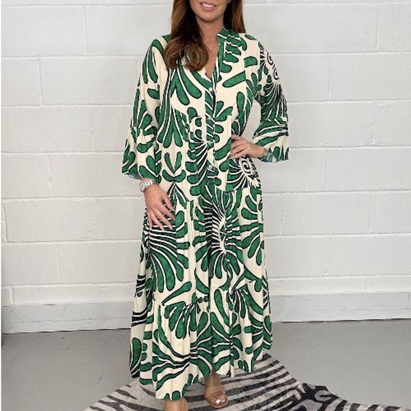Трансграничная мода Осень и Зима V-образный вырез Однобортный Принт Свободный Девятый рукав Средней длины Длинный Длина Рюши Платье Женское платье Green 2XL