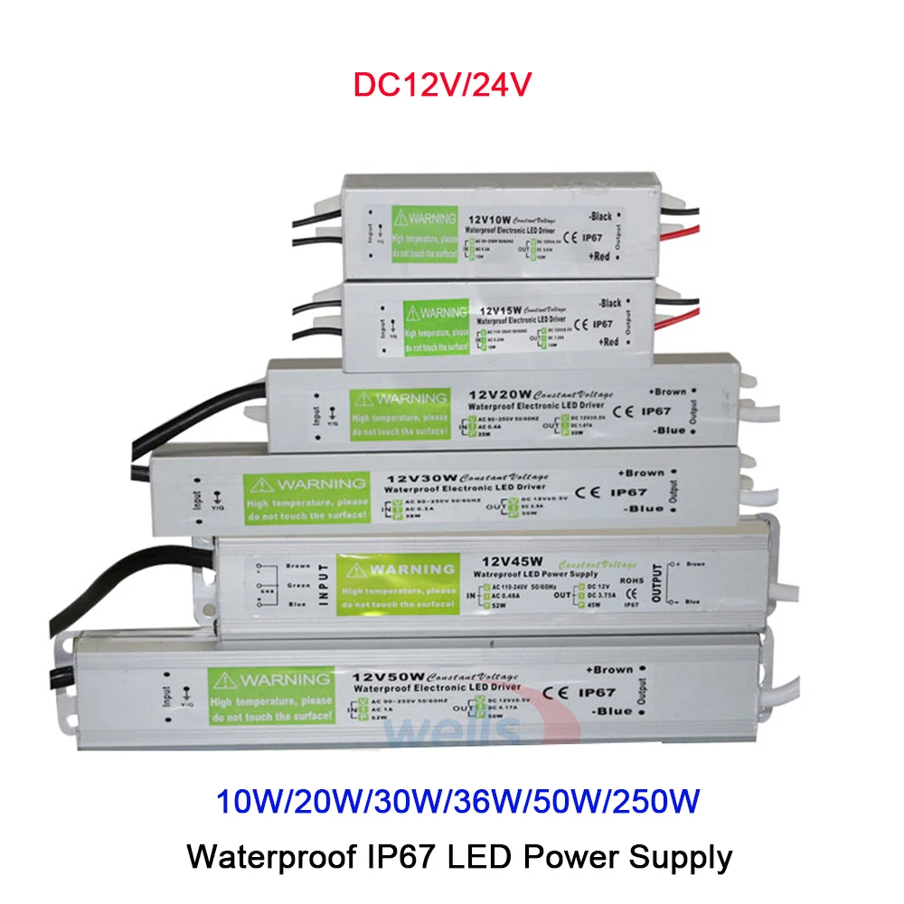 Трансформатор для светодиодсветильник лент, 12 В, 24 В, 10 Вт, 20 Вт, 30 Вт, 36 Вт, 50 Вт, 250 Вт, водонепроницаемый, IP67