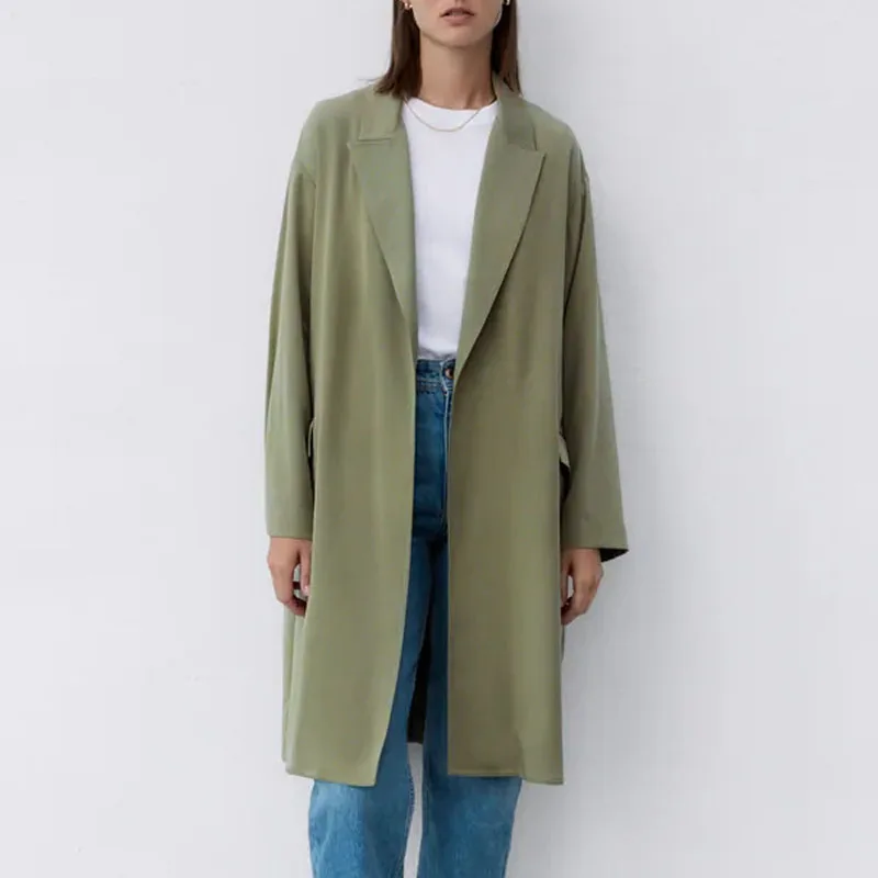 Тренчкот женский длинный с карманами, модная ветровка, офисное пальто с длинным рукавом, цвет зеленый/черный, на лето