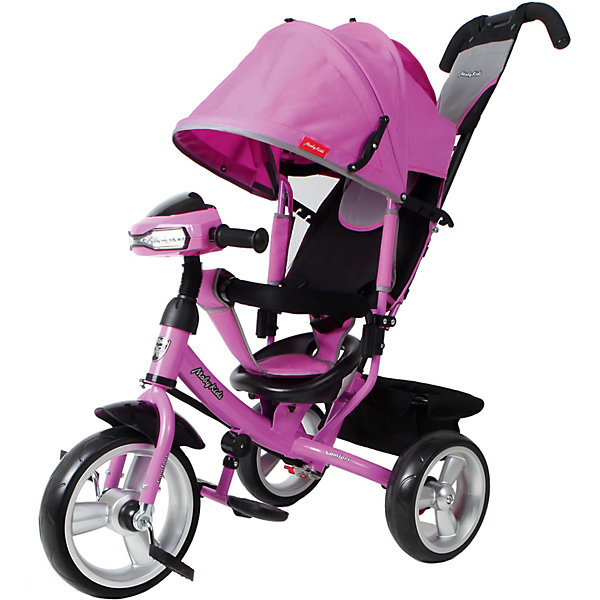 Велосипед на трех колесах имеет переключатель свободного хода переднего колеса. Таким образом, появляется возможность просто крутить педали без движения. Спинку можно установить в трех положениях. Велосипед предусматривает подставки для ног, которые складываются. Спереди встроена панель со светом и музыкой. При нажатии кнопок раздаются звуки машин, играет мелодия и включаются фары. Велосипед укомплектован багажной сумкой на металлическом каркасе.