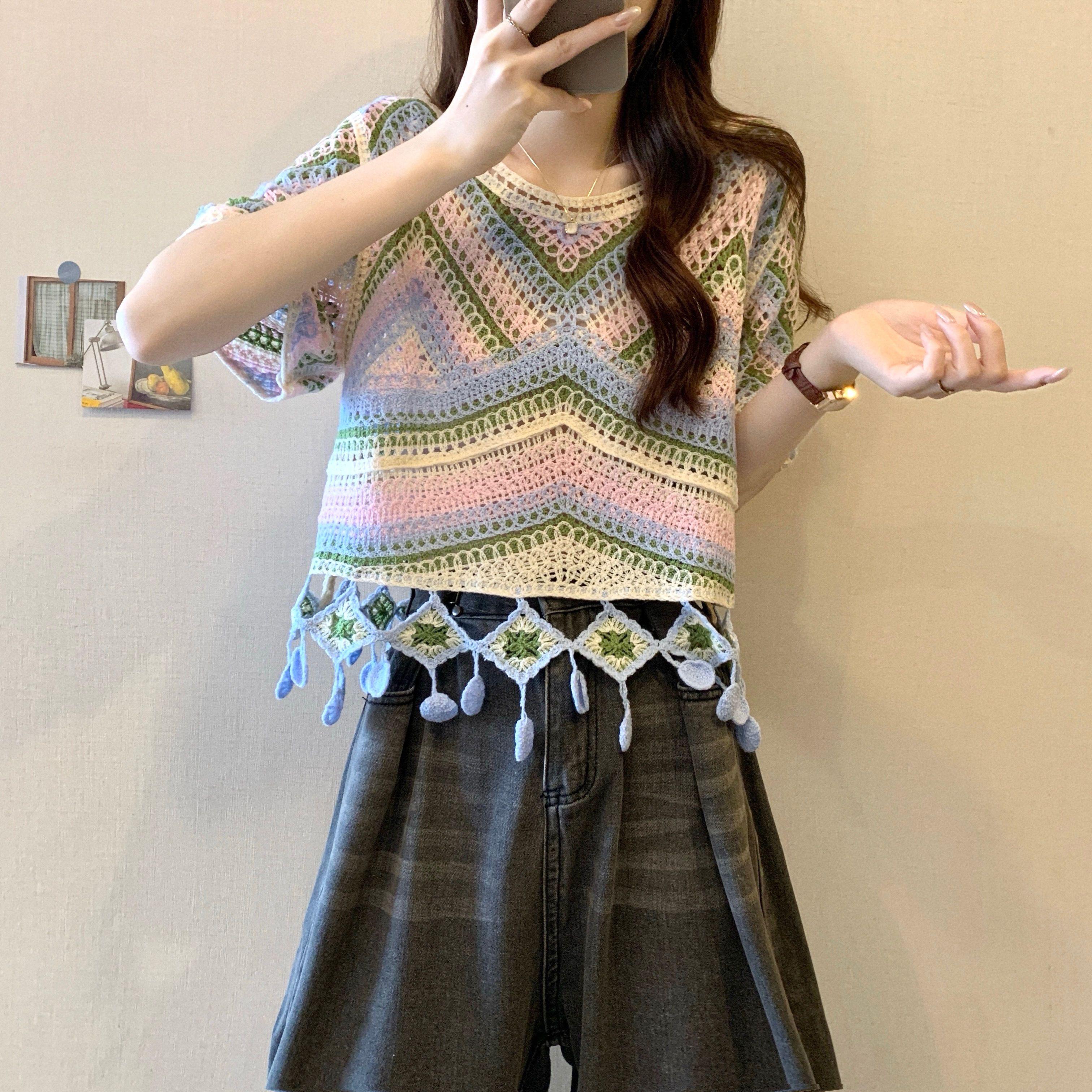 Трикотажная рубашка из ледяного шелка с вышитым ажурным узором в богемном стиле и короткими рукавами с цветочным узором в этническом стиле 1 one size зелёный