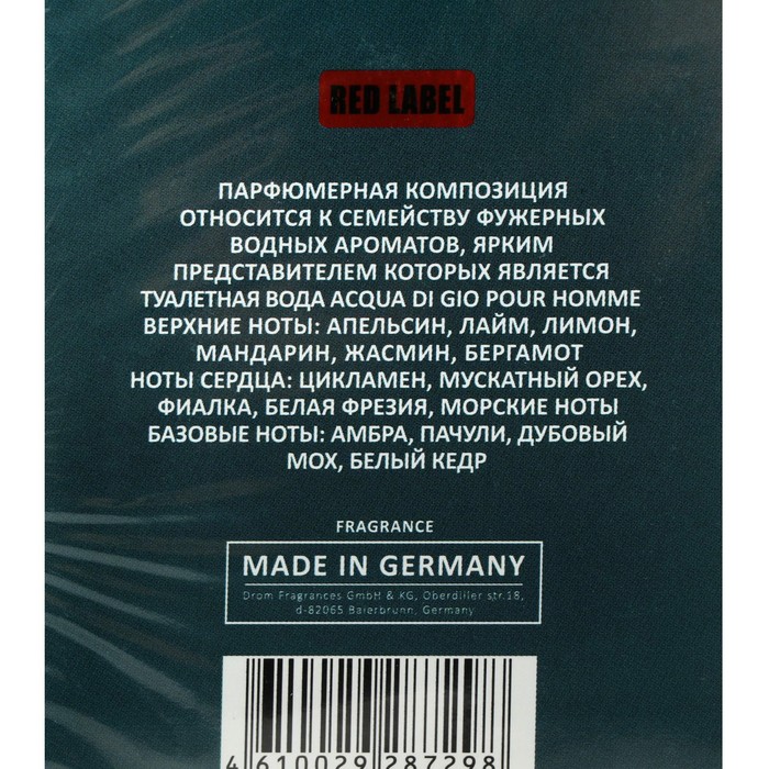 Философия аромата: Acgua di Gio (G.Armani).Семейство аромата: фужерные, водяные.Верхние ноты: апельсин, лайм, мандарин, жасмин, бергамот, лимон, нероли.Средние ноты: цикламен, мускатный орех, резеда, кориандр, фиалка, белая фрезия, роза.Базовые ноты: амбра, пачули, дубовый мох, белый кедр, белый мускус.