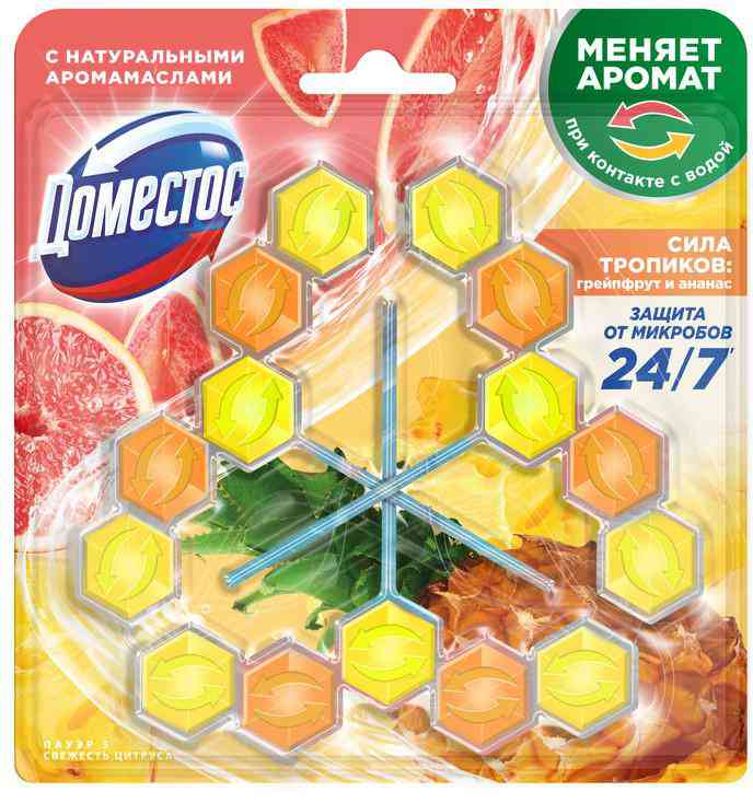 Доместос шарики для унитаза Сила тропиков - это эффективное решение для поддержания чистоты и свежести в вашем туалете. Уникальный сменный блок-ароматизатор заполняет туалетную комнату ароматом свежего грейпфрута, а при смывании – запахом сочного тропического ананаса, нейтрализует неприятные запахи 24/7', обеспечивая комфорт и гигиену.Преимущества:- Смена аромата при контакте с водой: запах сочного грейпфрута сменяется на тропический ананас- Нейтрализация запахов 24 часа в сутки- Эффективное очищение и защита от микробов- Сохраняет блеск надолго'- АнтиналетДоместос Сила тропиков поможет вам предотвратить образование известкового налета. Обильная пена, образующаяся при использовании средства, гарантирует эффективное очищение и сохранение блеска унитаза.В состав шариков Сила тропиков входят натуральные аромамасла, которые не только освежают воздух, но и обеспечивают защиту от микробов. Это позволяет предотвратить их размножение, что важно для поддержания гигиены туалетной комнаты.Освежитель для унитаза подвесной Доместос Сила тропиков – это идеальный выбор для борьбы с загрязнениями и известковым налетом.Для достижения 100% чистоты и гигиены'' рекомендуется использовать чистящее средство для унитаза совместно с гелем Доместос.'Защита от загрязнений (благоприятной среды для микробов), нейтрализация запахов, 24 часа 7 дней в неделю, при наличии блока.''Инструментальные тесты.