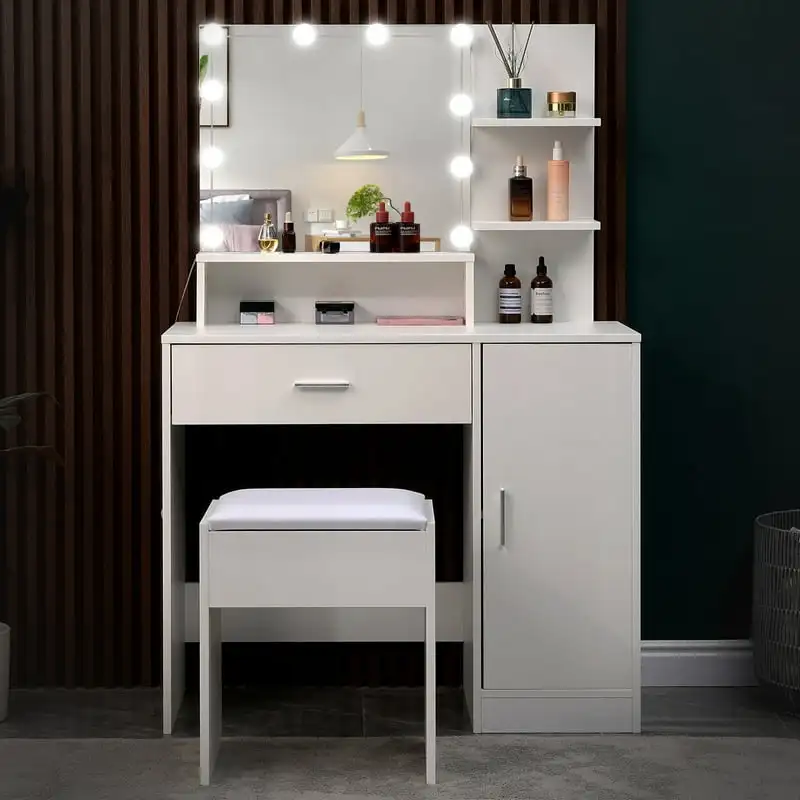 Туалетный столик С трехцветным зеркалом с подсветкой, большой ящик и трехуровневый столик для хранения (белый)