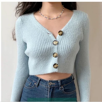 Spring Women's Candy Multicolor Solid Cardigan Sweater Deep V Neck Short Long Sleeve Single Breasted Cardigan