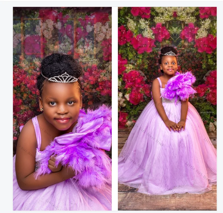 Luxury Feather Princess Flower Girl Dress Sexy Sleeveless Tulle Wedding Gown Kids Birthday Party Pageant Gown Customized