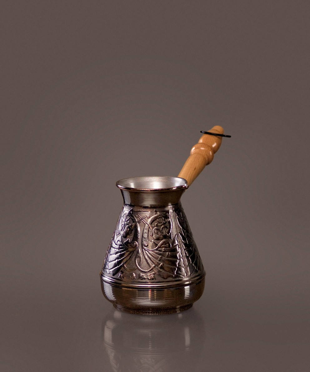 Турка медная Орнамент (360мл) Объем: 360 мл Материал: медь Материал ручки: дерево Высота: 101 мм Диаметр (снизу): 65 мм Диаметр (сверху): 55 мм Диаметр горловины: 46 мм Длина ручки: 165 мм Толщина меди: 1 мм При производстве кофеварок корпус соединяются с донышком методом припоя. После этого методом чеканки наносится рисунок по всей окружности корпуса. Медь по утверждению ученых самый подходящий для приготовления пищи металл на планете Земля, но окись меди вредна и поэтому внутренняя поверхность турок покрывается пищевым оловом толщиной 9-12 мкм. Таким образом, ни окись меди, ни окись припоя не попадает в продукт приготовления. Верхняя поверхность кофеварок покрывается напылением никеля. Никель является жаропрочным металлом и не позволяет при эксплуатации турки окислятся и тускнеть. Турки можно использовать на газовых, электрических и стеклокерамических плитах. Кофеварка выдерживает температуру 180С (градусов) без содержания внутри жидкости. Турки из металла наиболее долговечны и неприхотливы. Традиционно популярностью у кофеманов пользуются медные турки, исторически происходящие из восточных стран. Медь обладает равномерной теплопроводностью, что позволяет приготовить кофе, отличающийся изысканным ароматом. Cама турка имеет узкое горлышко, что также немаловажно для приготовления кофе. Наши турки имеют специальное внутреннее покрытие из пищевого олова, которое предохраняет медь от окисления. Существует громадное количество кофеварок, но истинные ценители кофе знают, что турка для кофе это идеальный выбор. Турка для кофе использовалась еще нашими предками и до сих пор не придумали ничего лучше для приготовления кофе. Дело в том, что электрические кофеварки или другие сосуды в которых готовят кофе имеют высокую теплопроводимость, а это плохо сказывается на качестве приготовляемого кофе. Настоящий кофе не должен кипеть как чай, он должен томиться на медленном огне впитывая весь аромат кофе. Турки для кофе бывают медные, керамические, серебряные, алюминиевые. Турка для кофе из керамики неплохо подходит для варки кофе, но керамическая турка хрупкая и в ней могут со временем образоваться микротрещины и сколы. Серебряная турка для кофе это идеальный выбор, она по свойствам близка к медной турке, но цена такой турки будет очень высокой. Самая популярная турка для кофе из меди, потому что медь имеет равномерную теплопроводность и кофе не пригорает к стенкам турки. Качественная турка имеет широкое дно и узкое горлышко, внутреннее покрытие должно быть из пищевого олова. При выборе турки для кофе уделите внимание ручке турки. Турка для кофе не должна быть с пластмассовой ручкой, иначе эта ручка со временем расплавится и деформируется, лучше всего брать турку с деревянной ручкой.