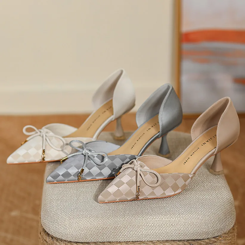 Туфли женские атласные в клетку, на высоком каблуке, с острым носком и бантом