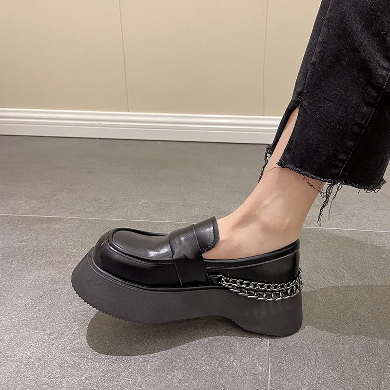 Туфли женские на платформе и толстой подошве, повседневные лоферы, винтажная кожаная обувь с круглым носком, на цепочке, в британском стиле, ...