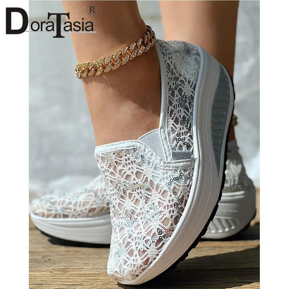 Туфли женские на танкетке, повседневные однотонные лоферы, блестки, круглый носок, кружево, плоская подошва, платформа, черные, белые, на лет...