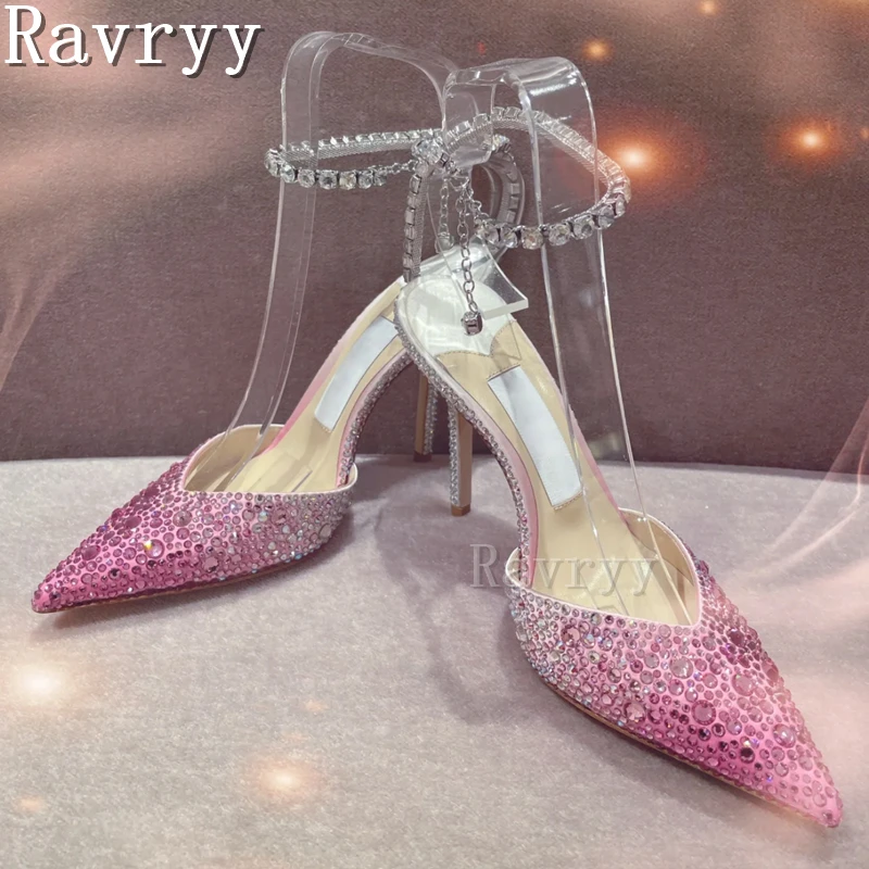 Туфли женские на шпильке, со стразами, цепочкой и ремешком на щиколотке, тонкий высокий каблук, Роскошные туфли-лодочки, розовые градиентные