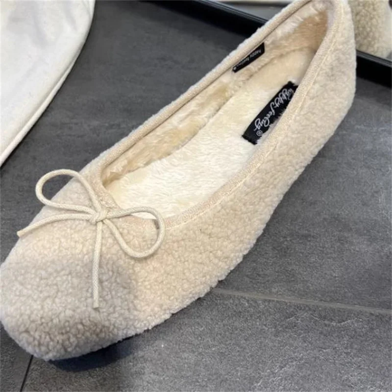 Туфли женские с бантом-бабочкой, квадратный носок, мех, плоская подошва, однотонные, с завязкой-бантом