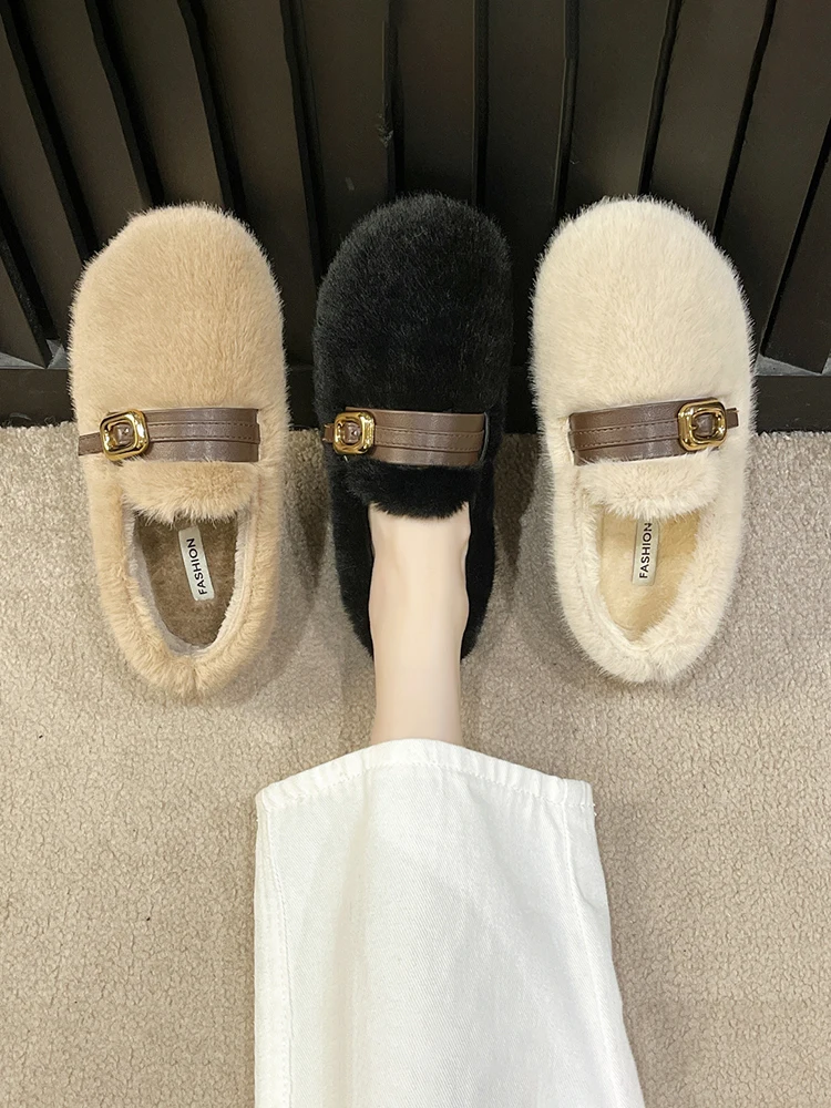 Туфли-лодочки женские с закрытым носком, меховые Мокасины, повседневные кроссовки, без застежки, Элегантная удобная зимняя обувь на плоской подошве, с круглым носком