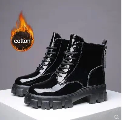 Туфли на толстом каблуке хлопковые ботинки со шнуровкой; Ботинки для женщин; Женские ботильоны из коровьей кожи; Лакированная обувь из теля...