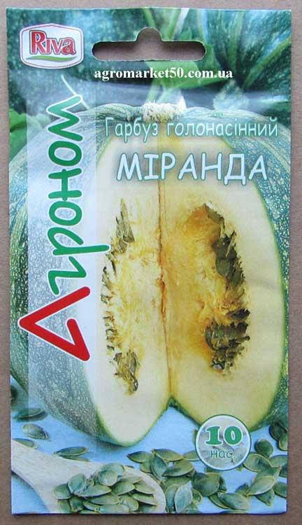 Миранда - среднеспелый сорт. Плоды светло-зеленого цвета, округло-приплюснутые, внутри с большим количеством оливково-зеленых семян без оболочки. Мякоть желто-оранжевого цвета, сочная. Первый польский сорт голосеменной тыквы предназначен для прямого потребления и переработки (отжим масла, семена соленое, добавка к выпечке и т.д.).Растение тепло-, свето- и влаголюбивое, поэтому высевать в открытый грунт рекомендуется в конце апреля - начале мая. Тыква Миранда отличается полукустовым типом роста, что позволяет выращивать этот сорт на небольших участках. На одном побеге формируется 3-4 плода. Урожай с 1 га 50-80 тонн плодов, семян 400-600кг. Оптимальная температура для высева при прогреве почвы - до + 15 ° С. Вегетационный период - 100-110 дней.Норма высева 0,3 г на 1 м2.Глубина заделки семян 5 см.Ширина междурядий 70 см.