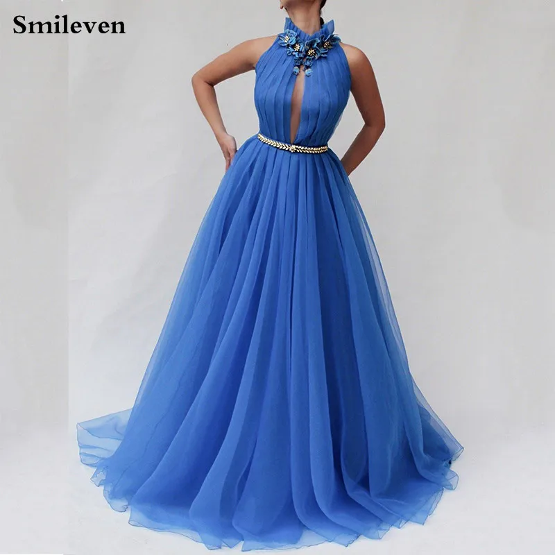 Тюлевое вечернее платье Smileven, синее, с высоким воротом и 3D цветами, для выпускного вечера