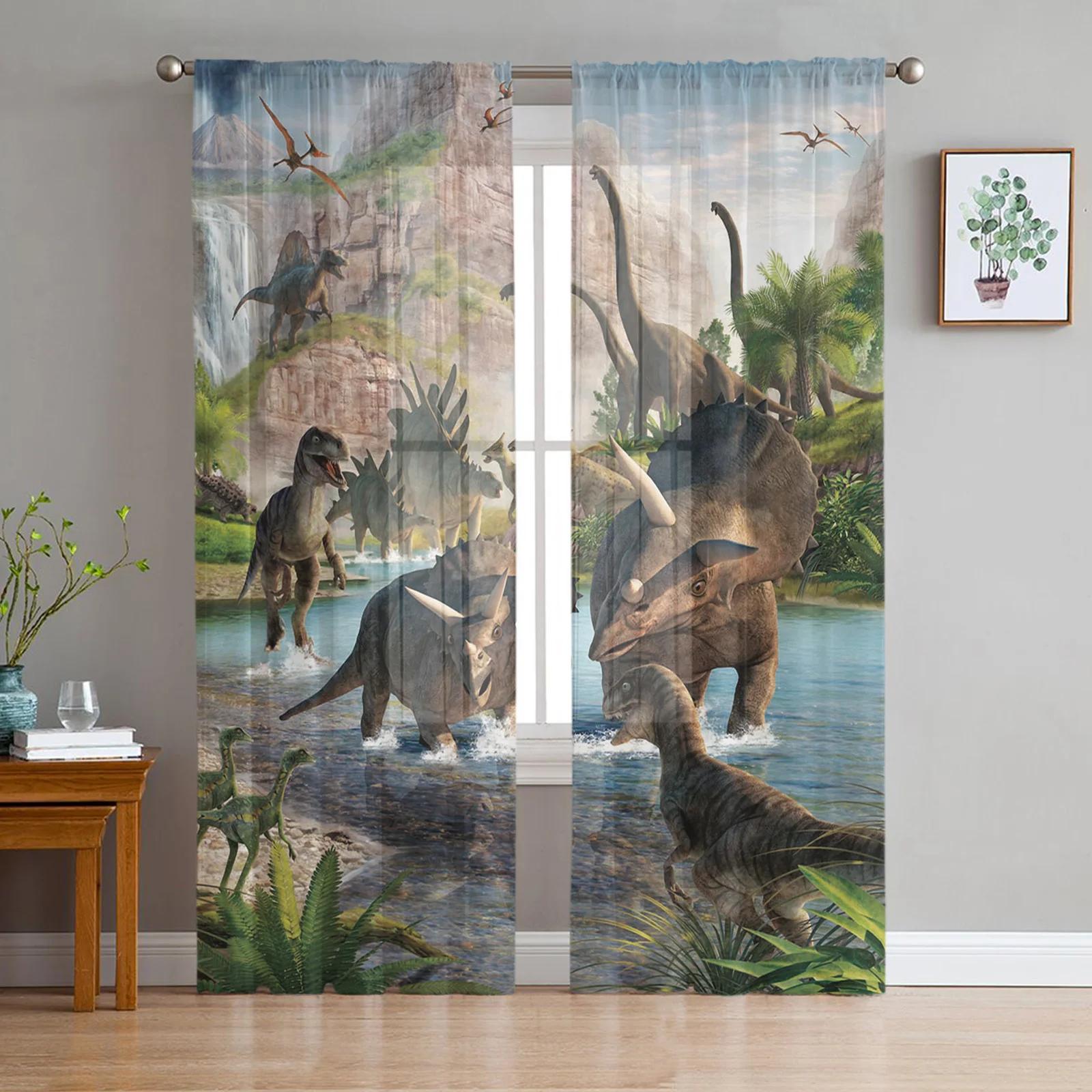 Тюлевые шторы с изображением динозавра для гостиной с принтом, прозрачная вуаль, занавеска для спальни, оконные шторы, жалюзи, домашний декор W135 x H115cm x1&Grommet Top