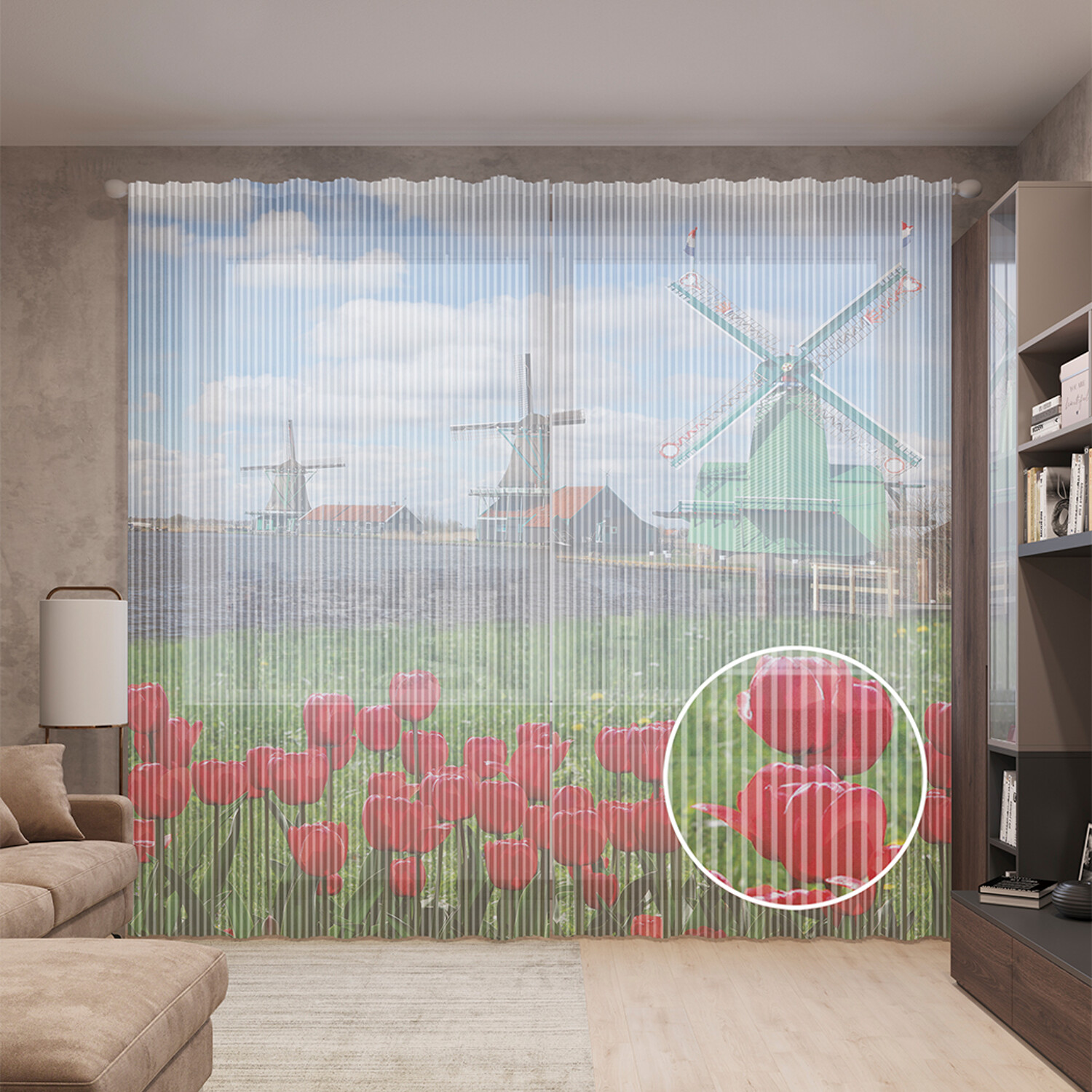 Тюль вуаль на шторной ленте с принтом JoyArty "Тюльпаны с мельницами", 310х265 см, Тюльпаны с мельницами