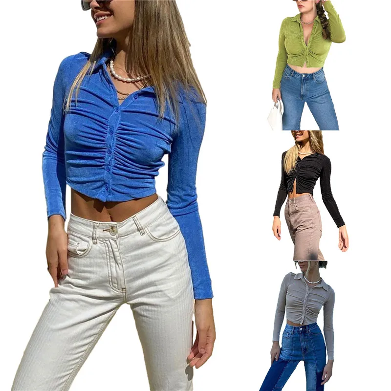 УКОРОЧЕННЫЙ ТОП Y2k на пуговицах с длинным рукавом, рубашка на осень и весну, однотонный кардиган с завязкой, Винтажная футболка, блузка, улич...