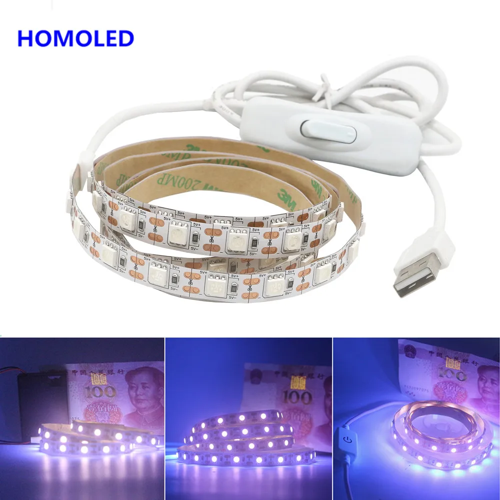 УФ-светодиодная ленсветильник с чипом SMD 5050, 60 светодиодов/м,-нм, 5 в постоянного тока, USB, 1 м, 2 м