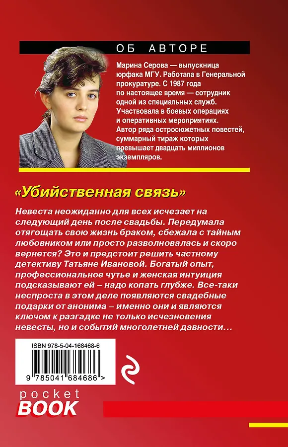 Марина Серова — феномен современного отечественного детективного жанра. Выпускница юрфака МГУ, работала в Генеральной прокуратуре. С 1987 года по настоящее время — сотрудник одной из специальных служб. Участвовала в боевых операциях и оперативных мероприятиях. Автор ряда остросюжетных повестей, суммарный тираж которых превышает двадцать миллионов экземпляров.