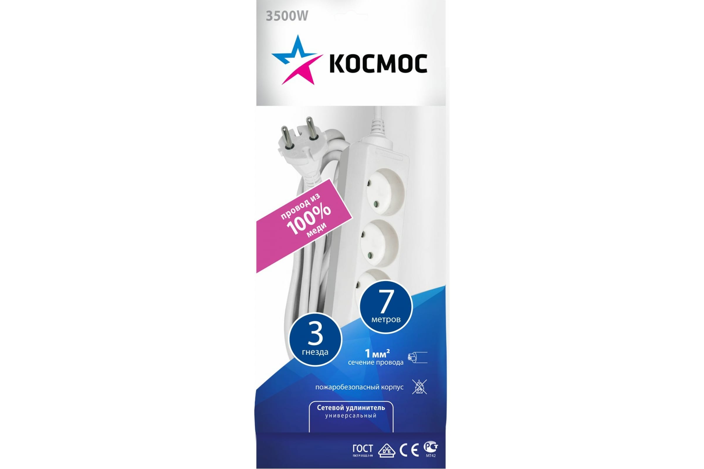 Удлинитель Космос ПВС, 3-розетки, 7м, белый (YKsm7m-3g(K)), ПВС