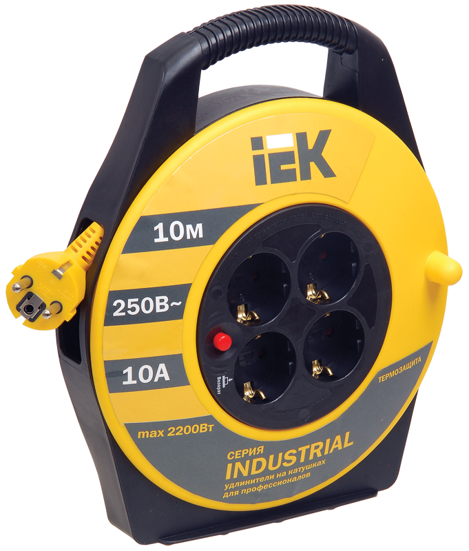 Удлинитель на катушке IEK Industrial УК10, 4-розетки, 10м, желтый/черный (WKP15-16-04-10), УК10