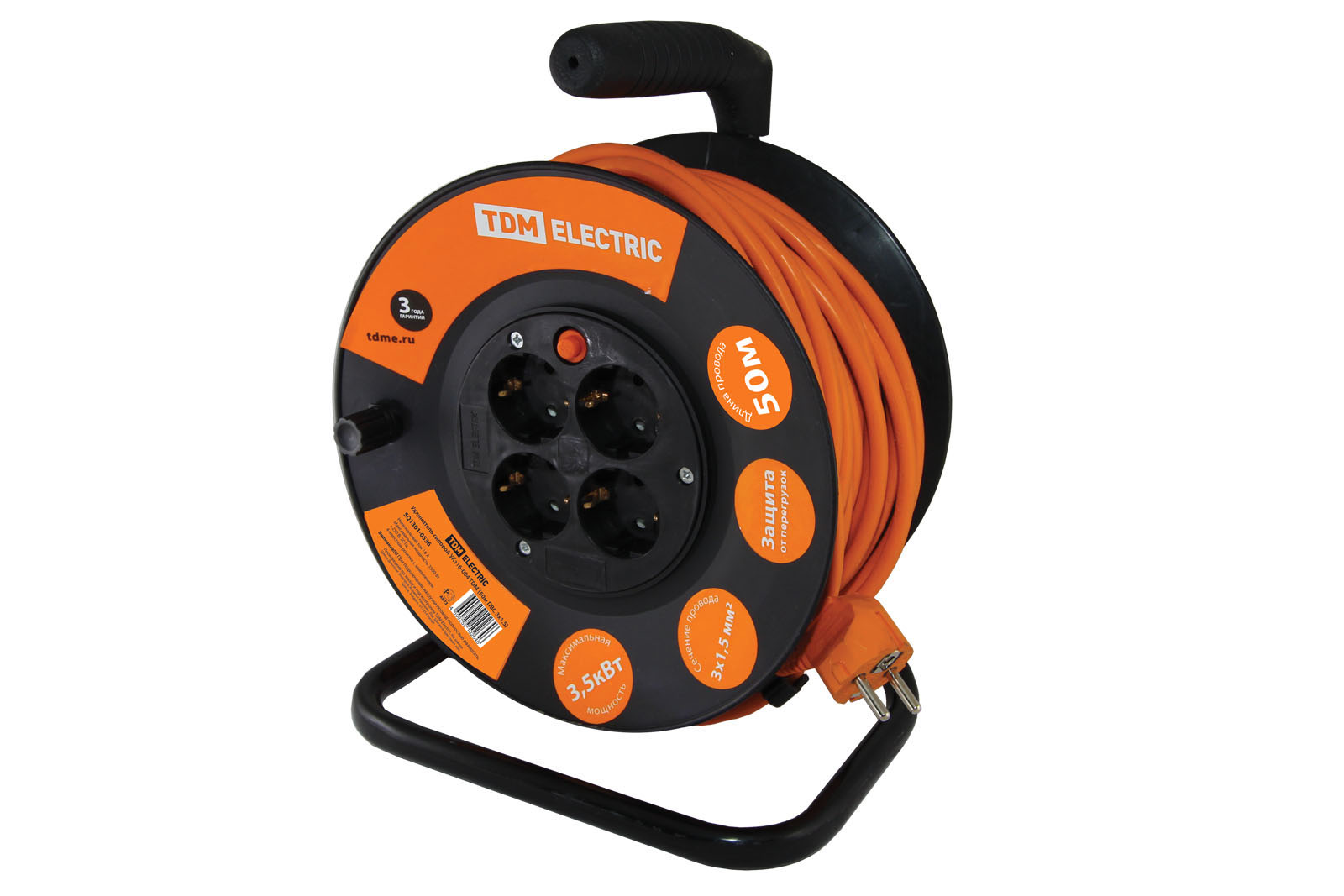 Удлинитель на катушке TDM УКз16-004, 4-розетки, 50 м, черный/оранжевый (SQ1301-0536), УКз16-004
