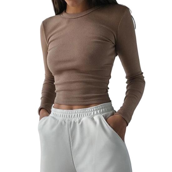 Узкая трикотажная футболка с круглым вырезом и длинными рукавами, женская сексуальная женская футболка в рубчик с обнаженным пупком L коричневый