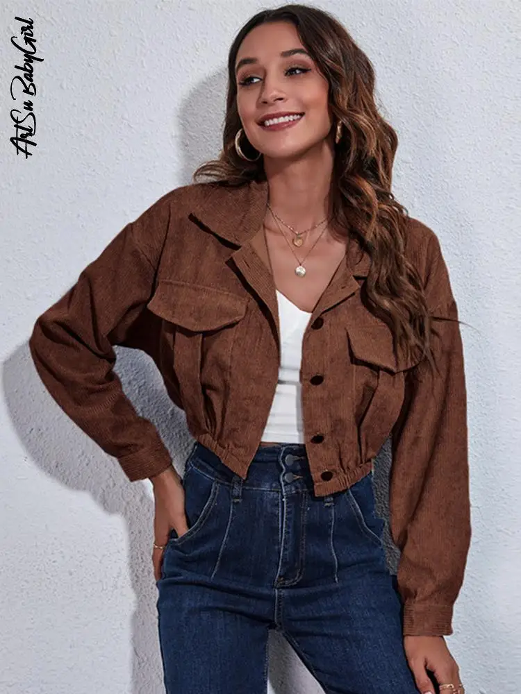 Укороченные куртки, однобортная верхняя одежда, вельветовое пальто, осенне-зимняя одежда, новая уличная одежда, однотонная коричневая Женская куртка