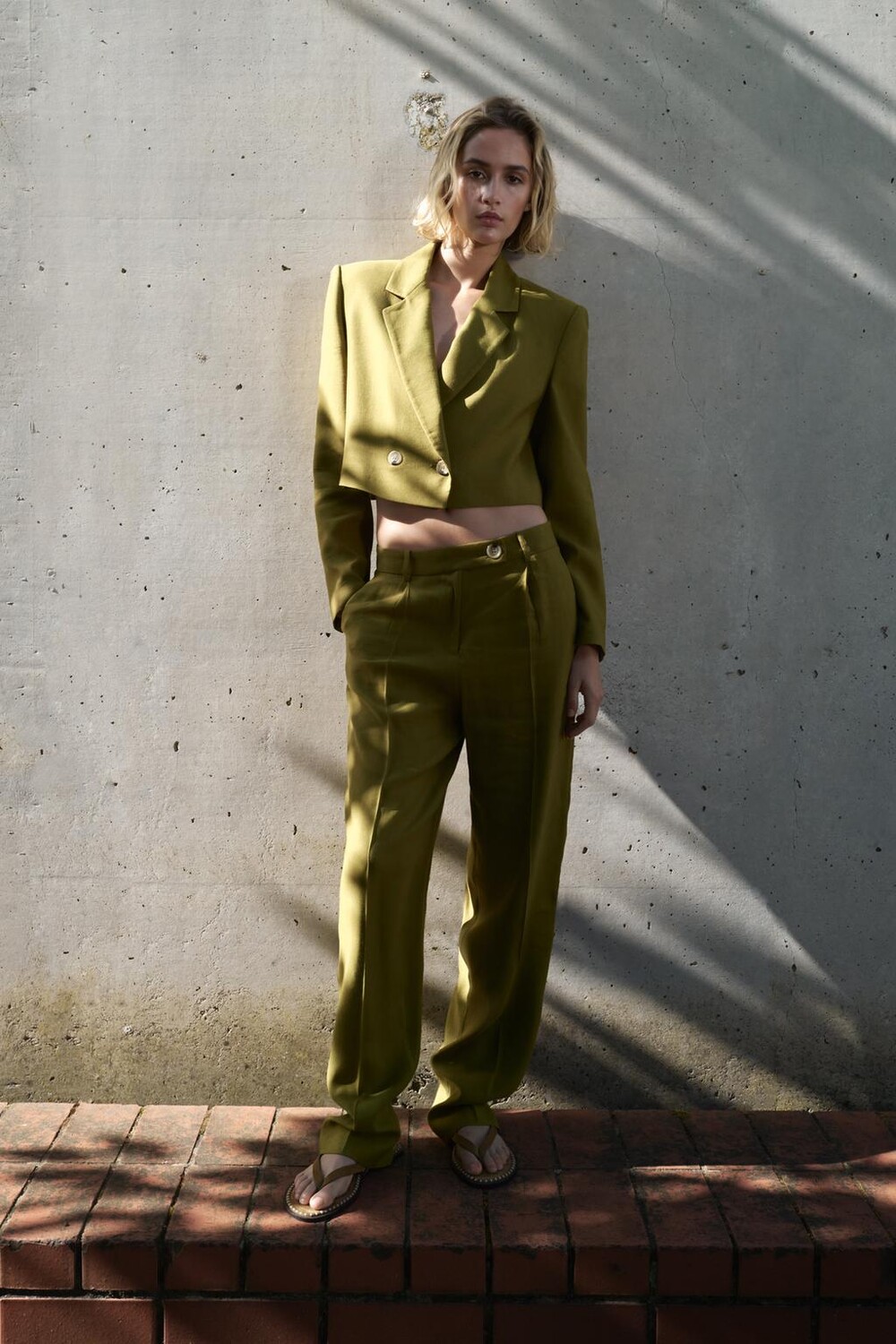 Укороченный двубортный пиджак из льна ZARA, хаки
