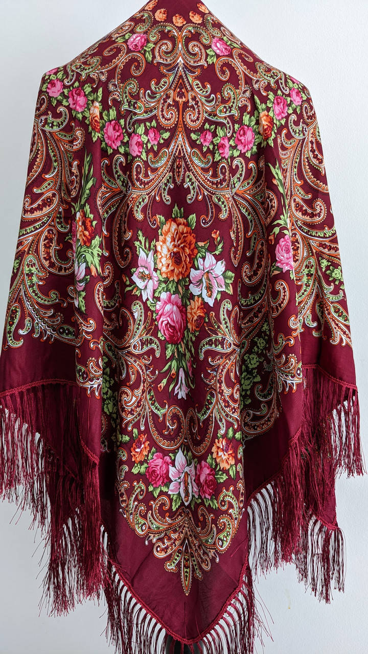 Жіноча хустина з квітковим орнаментом, в українському стилі, колір бордо