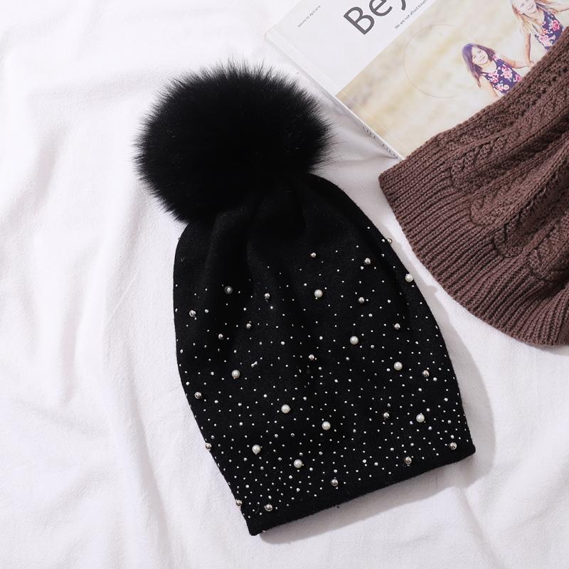 Украшение жемчугом женская шапка вязаная шерстяная шапка модная натуральная меховая шапка с помпоном из меха енота осень-зима теплая повседневная женская шапка