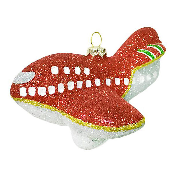 Украшение крепится на елку с помощью петельки для шнурка. Игрушка усыпана блестками, имеет яркий дизайн. Кроме того, самолетик не бьется при падении.