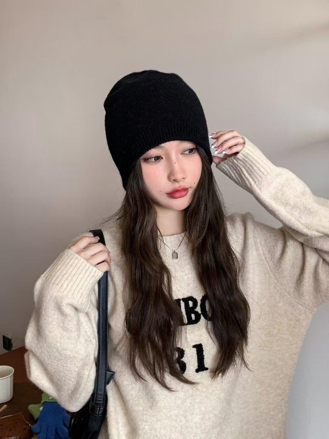 Уличная вязаная шапка из 100% шерсти мериноса, женская осенне-зимняя теплая утолщенная двухслойная шерстяная шапка однотонная универсальная шапка-пуловер M(56-58cm) чёрный