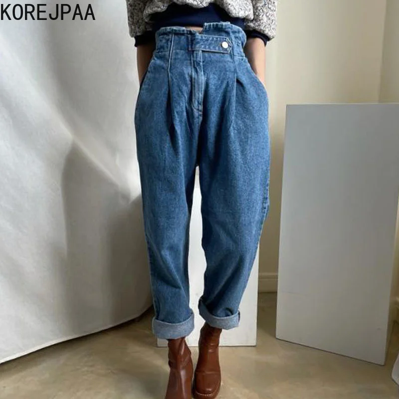 Уличная одежда кореjpaa эластичные джинсы с высокой талией корейские Ретро брюки шаровары на одной пуговице с двойными карманами Весна 2022