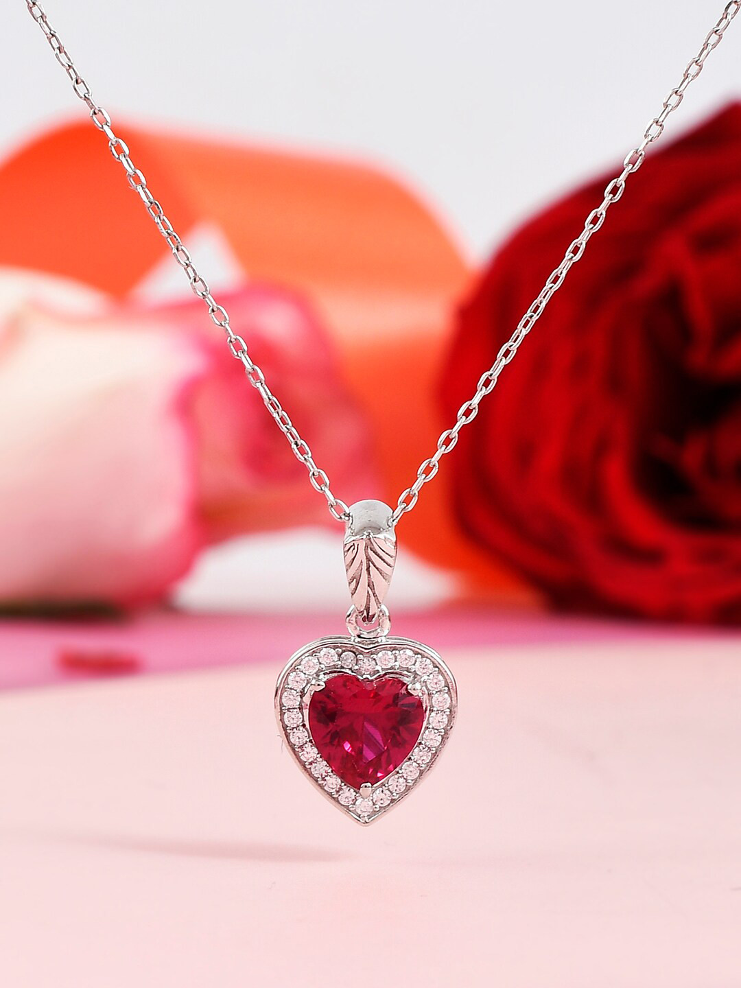 Studio Voylla 925 Sterling Silver Rhodium-Plated CZ Heart-Charm Pendant With Chain, Red