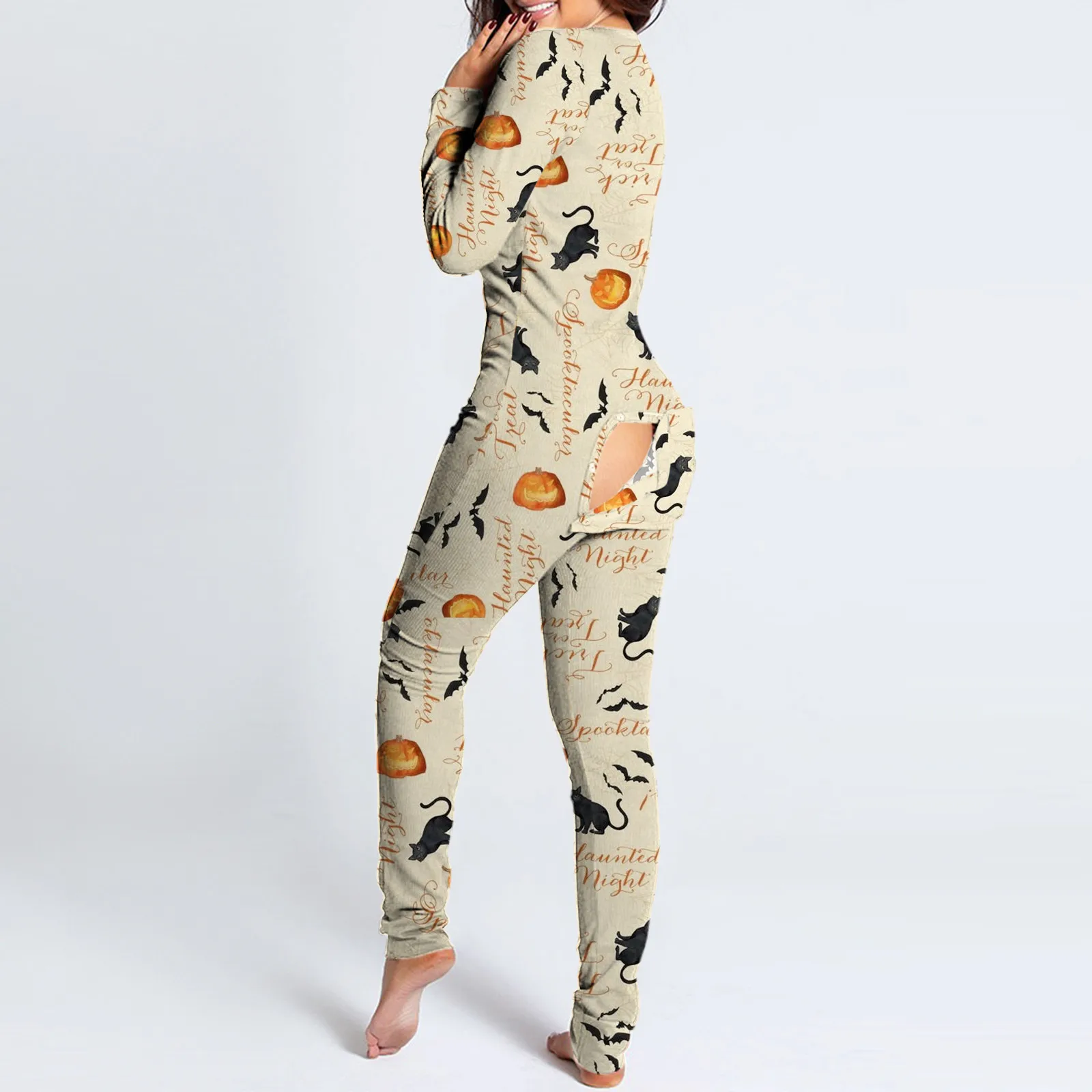 Women Onesies Sexy Adults Halloween Pumpkin Print Sleepwear Romper Women's V-neck Buttoned Open Butt Pajamas Long Nightwear