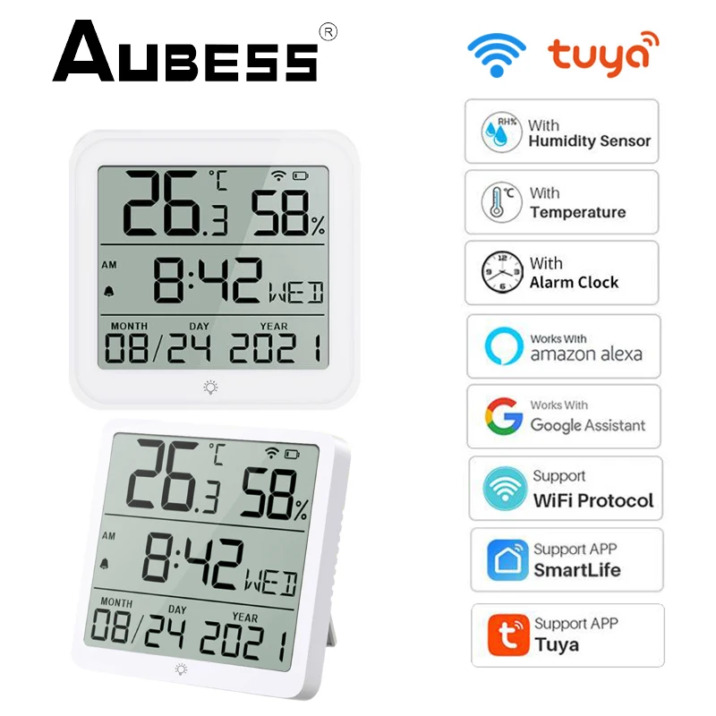 Умный Wi-Fi датчик температуры и влажности Tuya, комнатный гигрометр, термометр с будильником, работает с Alexa Google Assistant