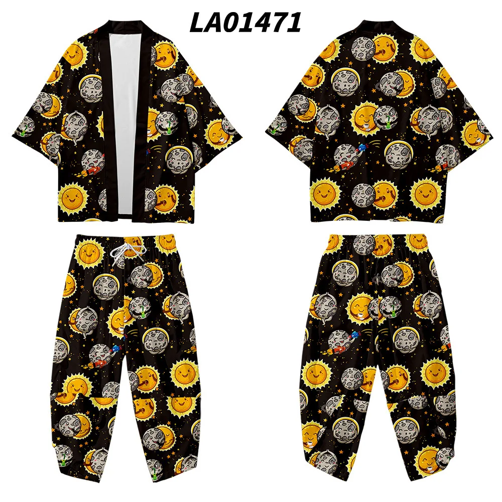 Men's Cardigan Kimono Japan Black Print Clothes And Pant Beach Robe Japanese Style Kimono Streetwear haori yukata Shirt