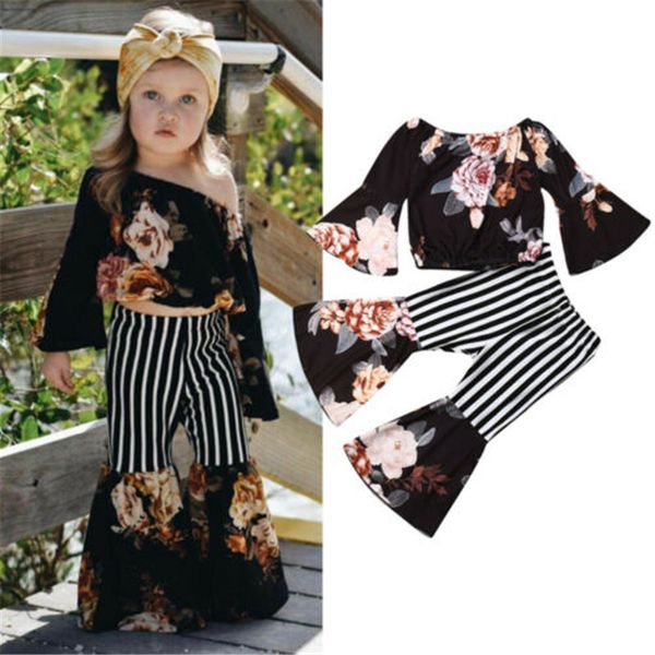 1-6t cute baby girls clothes set floral print t-shirt for girls long sleeve girls t shirt striped flare long pants children set, White;black