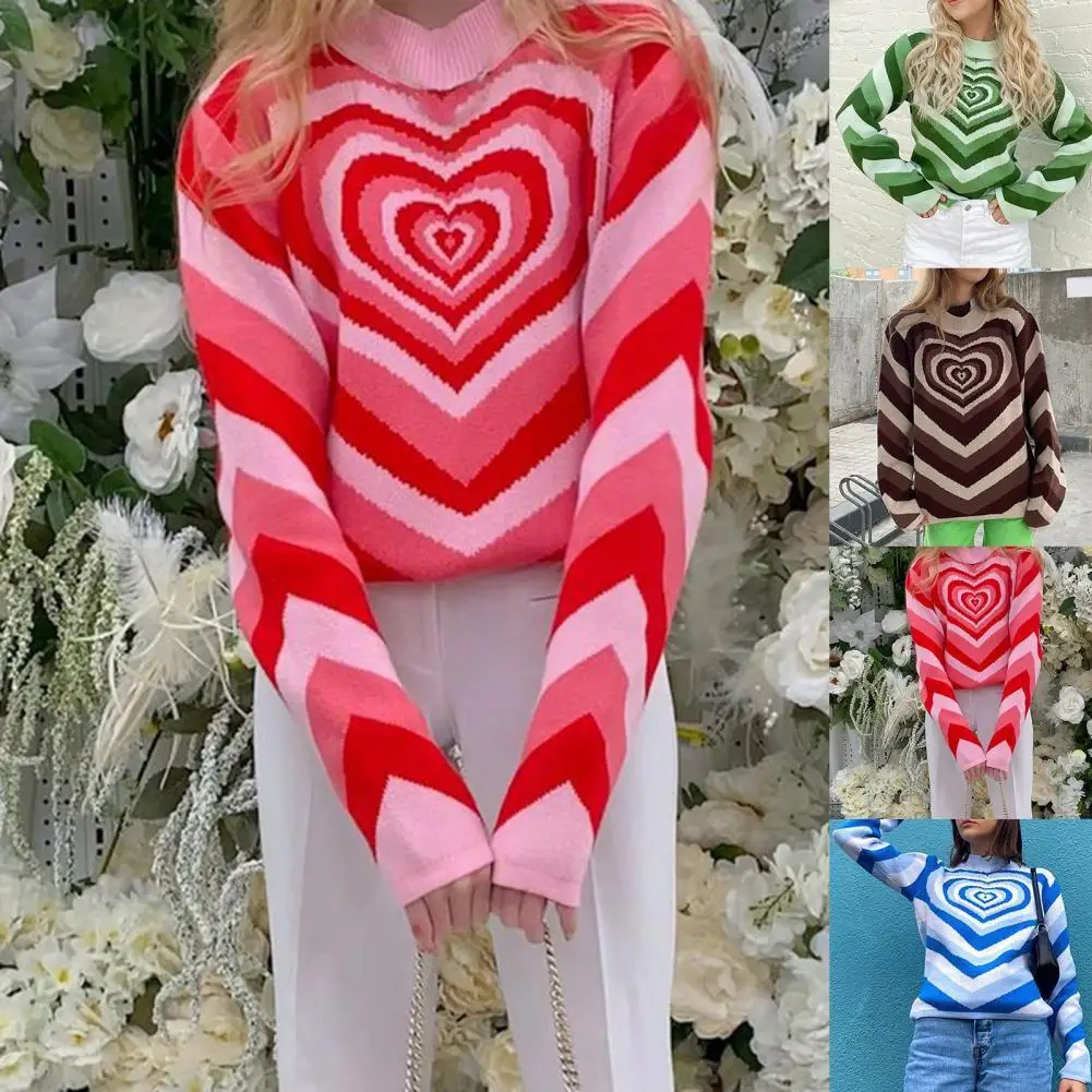 Универсальный классический вязаный свитер с принтом сердечек и волн, вязаный пуловер с волнистым сердечком для улицы