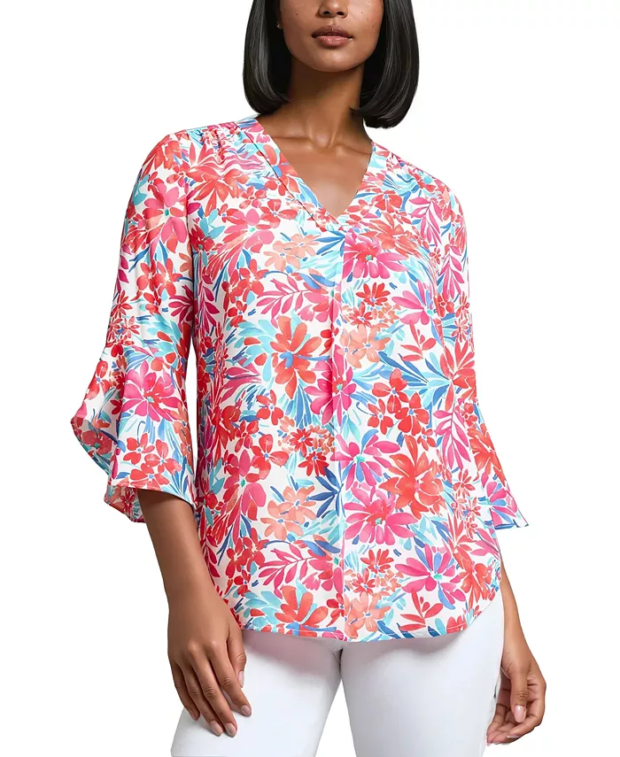 Женская блузка с V-образным вырезом и расклешенными рукавами в цветочном принте Jones New York, мультиколор