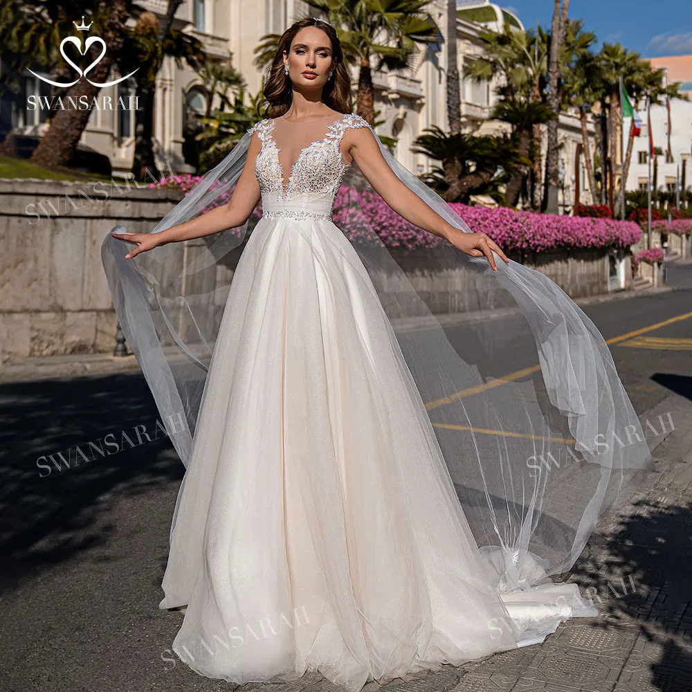 Shiny Sleeveless Wedding Dress 2023 Chic Beaded A-Line Court Train Princess Vestido De Novia SwanSarah AG80 Backless Bride Gown