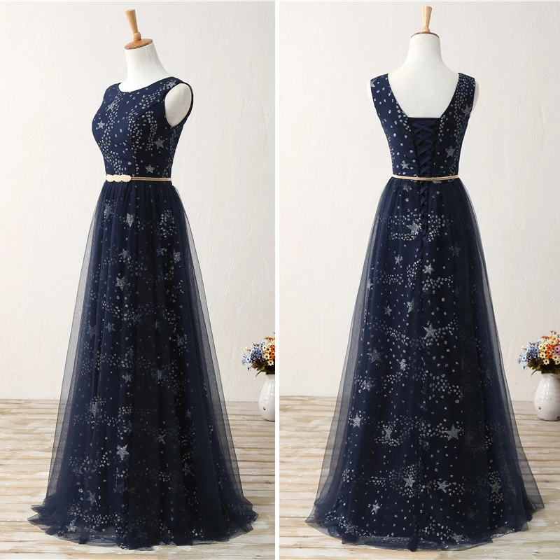 Blue Sleeveless Long Formal Dress Elegant Star Shiny Sequin O Neck Backless Lace Up A Line Floor-Length Evening Dresses Long New