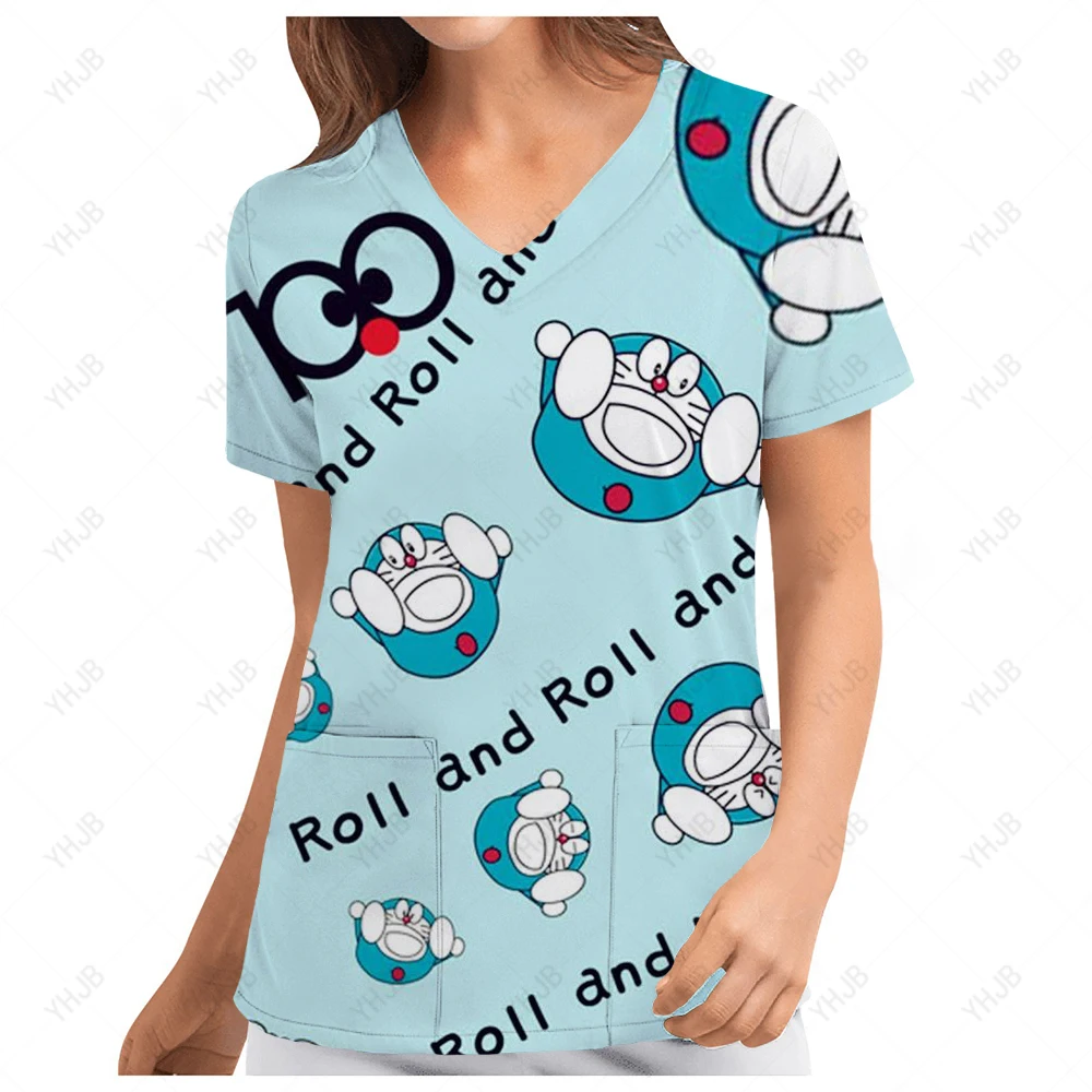 Униформа женская с принтом Дораэмон, спецодежда с коротким рукавом и V-образным вырезом, блузка с карманами, туника для медсестер