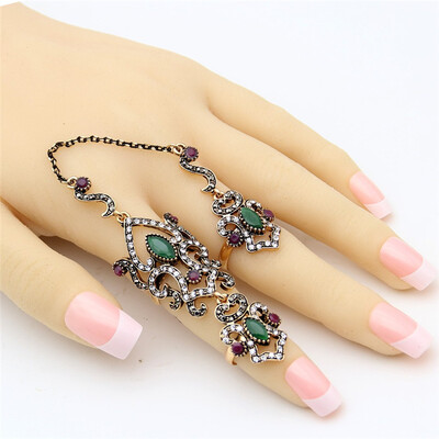 Урожай Турецкая женщина Цветочная смола Регулируемое двойное кольцо перста Арабески Кристалл Ювелирные изделия Античный золотой цв