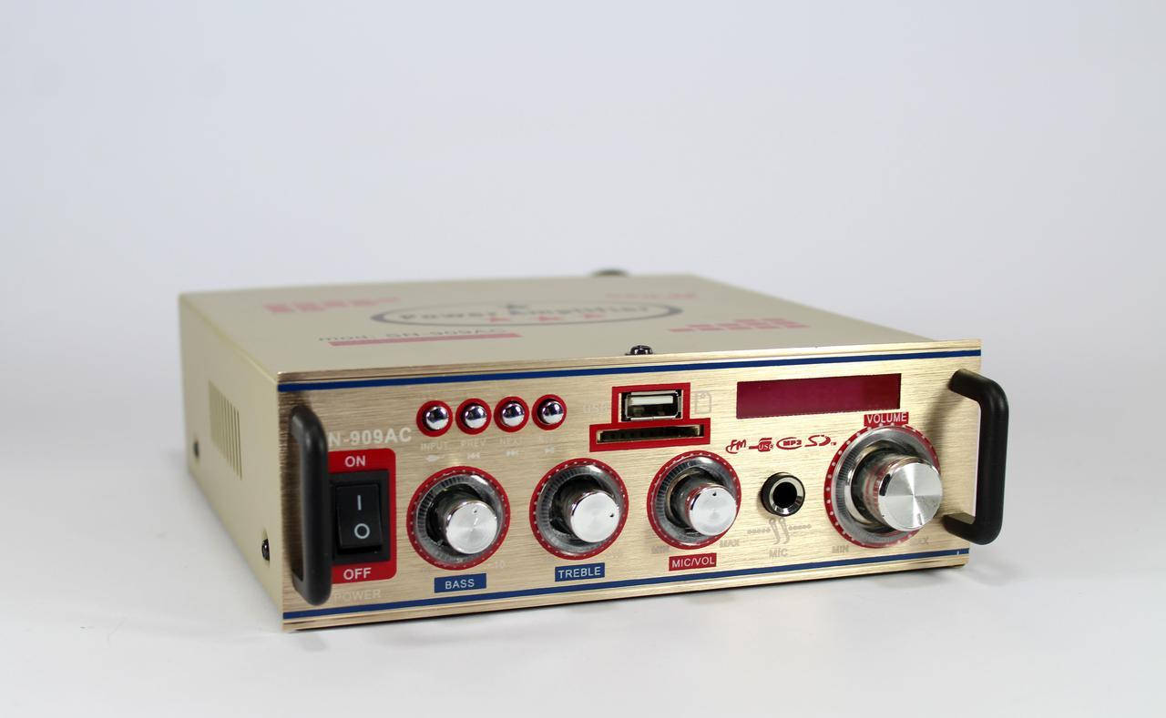 Стерео усилитель Ukc SN-909AC – интегральный усилитель со встроенным медиаплеером, FM тюнером, с поддержкой Usb флешек и карт памяти SD, есть функция Karaoke. Ukc SN-909AC – недорогой стерео усилитель, небольших размеров 175*175*55 мм, работает от сети 220V или от адаптера 12V 5A, в комплекте есть пульт ДУ. Усилитель обеспечивает выходную мощность по 30 Вт на каждый из каналов, при равномерной частотной характеристике в диапазоне 20 Гц – 20 000 Гц.