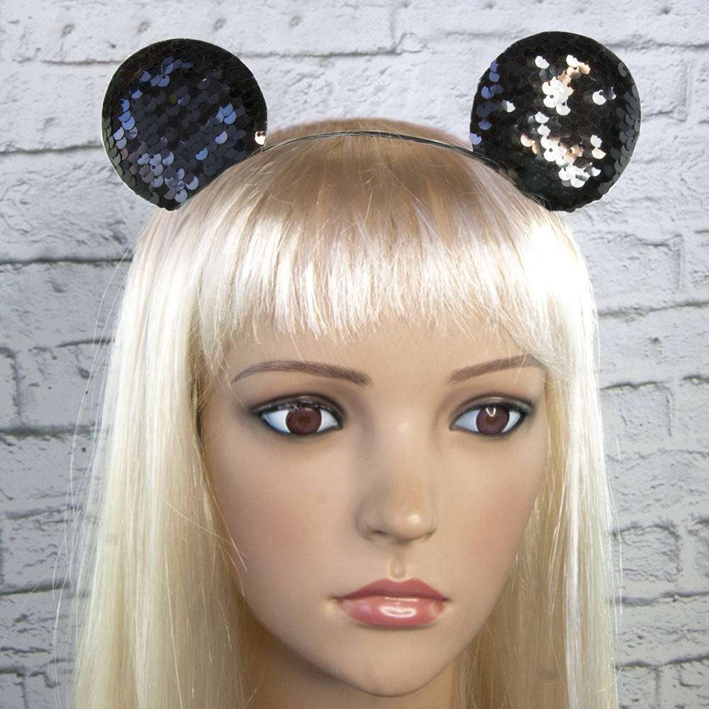 Ушки Микки Мауса с паетками черный – это атрибут сказочного героя – жителя волшебной страны Дисней-ленд . Кто не знает яркую парочку – Микки Мауса и его игривую подружку Минни? Специально для маленьких кокеток интернет-магазин предлагает приобрести оригинальный подарок для предстоящего карнавала – ушки, которые таинственным образом способны быстро поднять настроение. Ушки прочно зафиксированы на удобном упругом ободке для волос, они не причинят дискомфорта крохе и позволят предаться празднику в полной мере. Но купить оригинальный аксессуар можно и по поводу взрослой вечеринки – мультяшные герои – желанные гости на любом празднике!Размер: 17х14см, ушко 6х4,5смЦвет: черныйМатериал: текстиль, паетки, металлПроизводитель: Китай