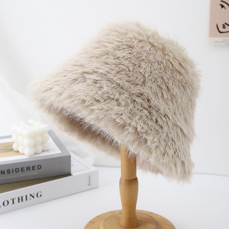 Уютная женская панама из искусственного меха — плюшевая зимняя шапка-рыбак с этикеткой, теплая и стильная для круглых лиц бежевый